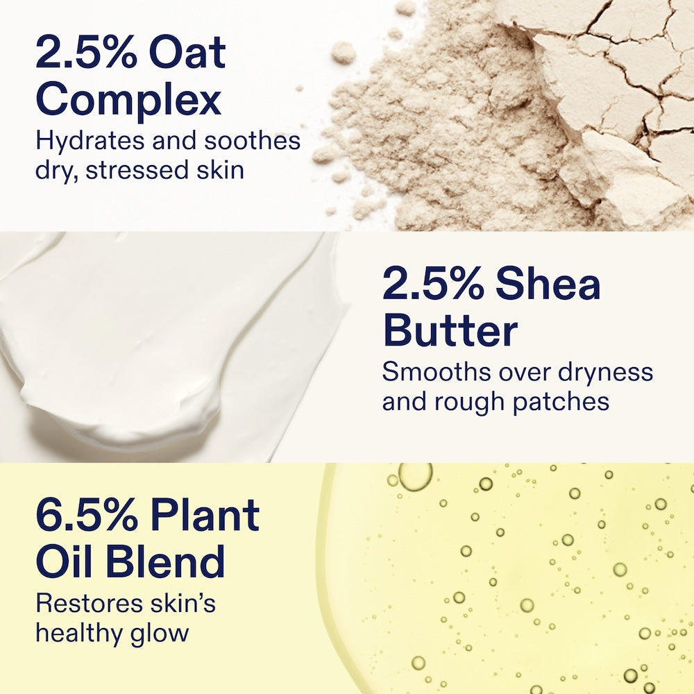 - 2.5% Oat Complex: A deeply hydrating, triple-oat blend that soothes dry, stressed skin