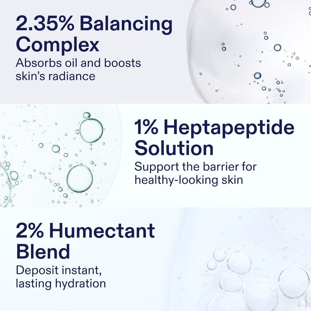 - 1% Heptapeptide Solution: Prebiotic peptides that support the barrier for healthy-looking skin