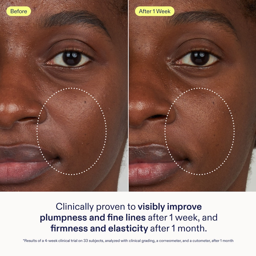 - Clinically proven to visibly improve plumpness and fine lines after 1 week, and firmness and elasticity after 1 month*